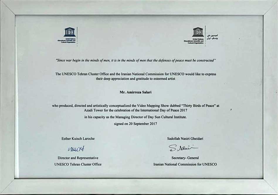 في مشروعه الجديد لرسم الخرائط بالفيديو والتركيب المسمى Rooz Elst ، يمزج Amirsalari الكرات والنجوم والسحب التي تعكس الضوء في الوقت المناسب مع الموسيقى في السماء. ويقول: “هذا العمل يغرس إحساسًا بالخلق اللامتناهي ودقة العالم وتعقيده لجعل البيئة المحيطة بالجمهور على مستوى من الكم إلى المستوى الكوني”.